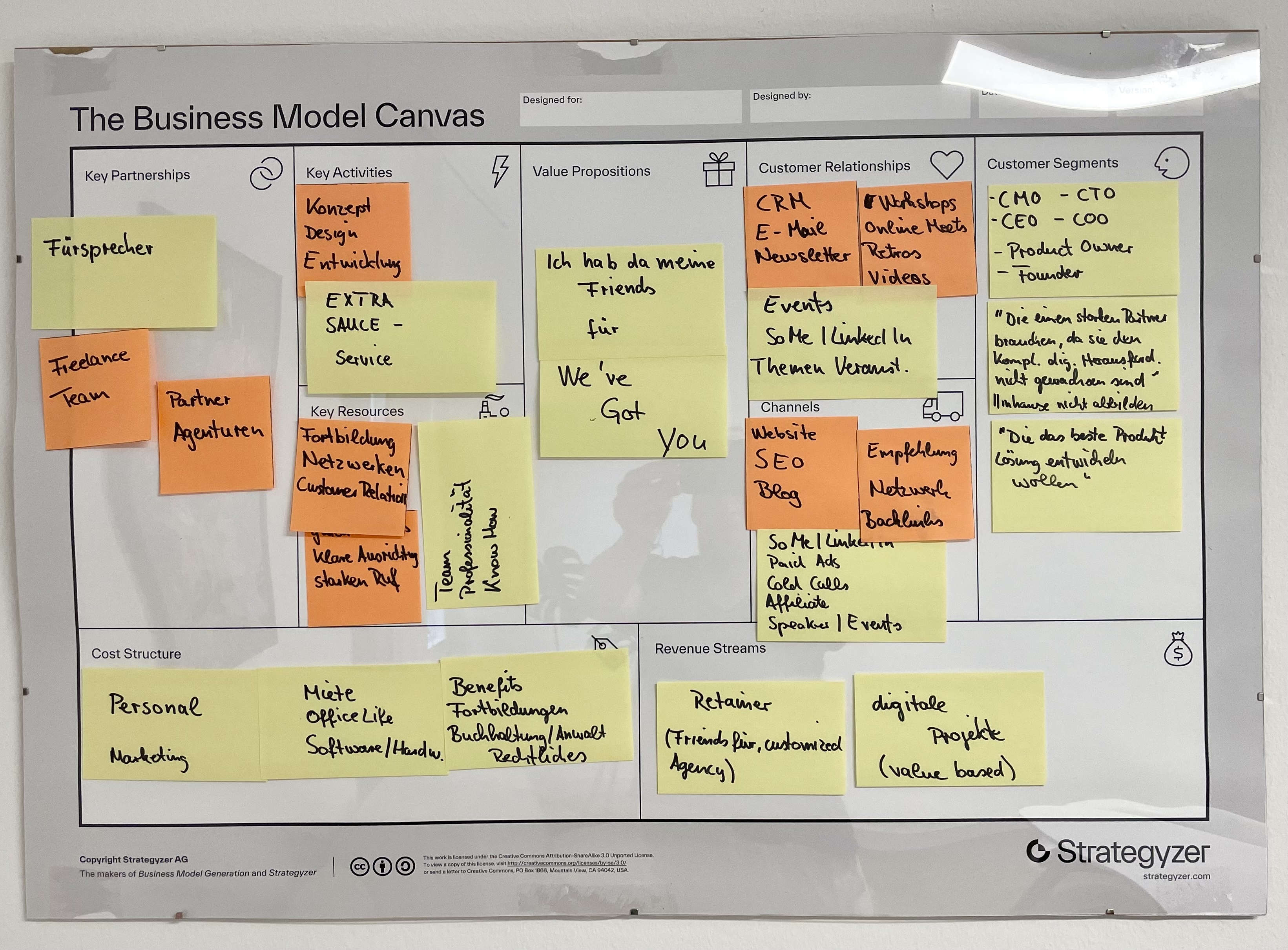 Wir haben unser gemeinsam entwickeltes BMC in unserem Besprechungszimmer aufgehängt. Um es immer sichtbar zu haben und damit es kontinuierlich weiterentwickelt wird, anstatt zu verstauben. Businesses müssen leben, oder was denkt ihr? Seht selbst !!