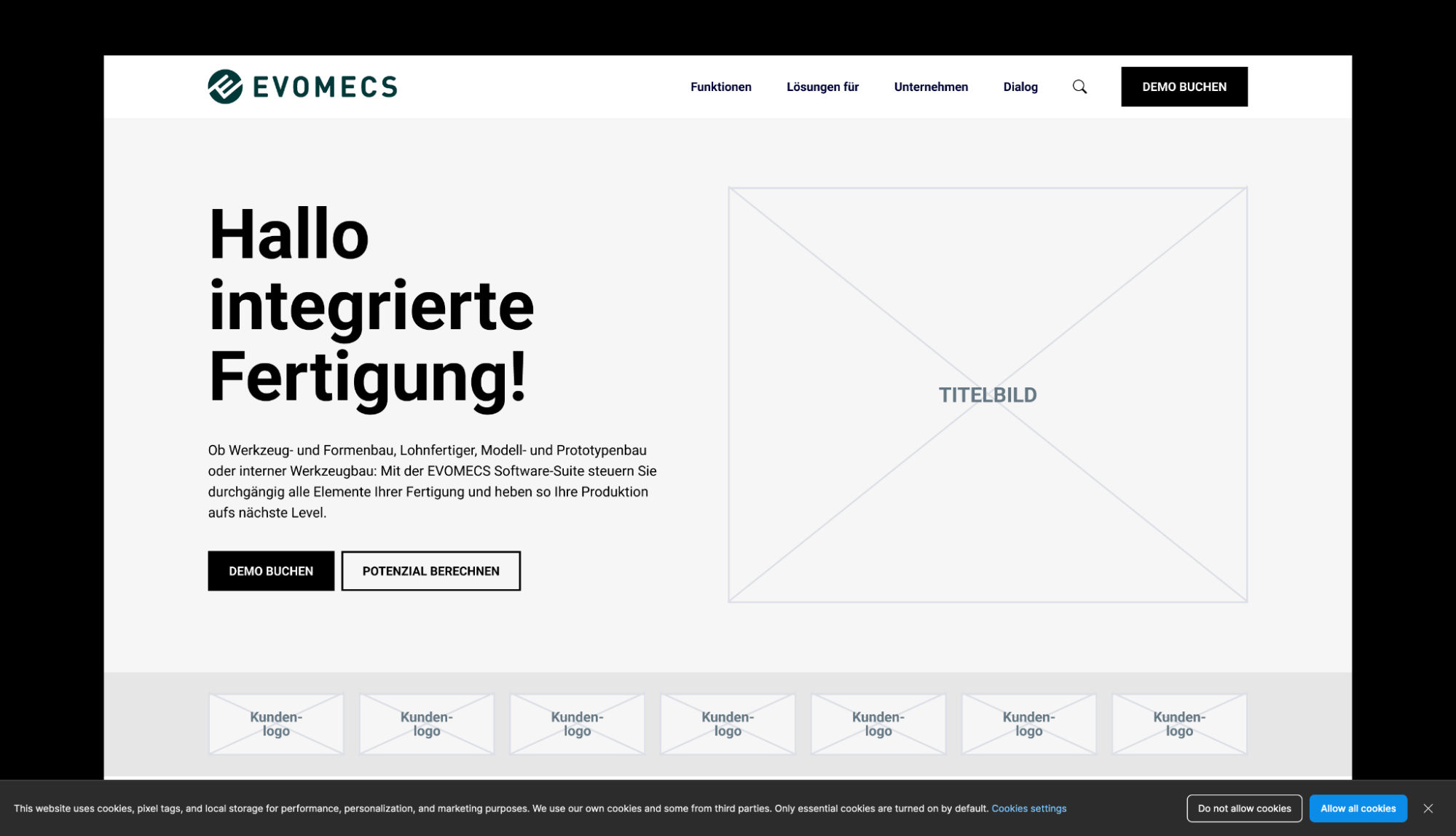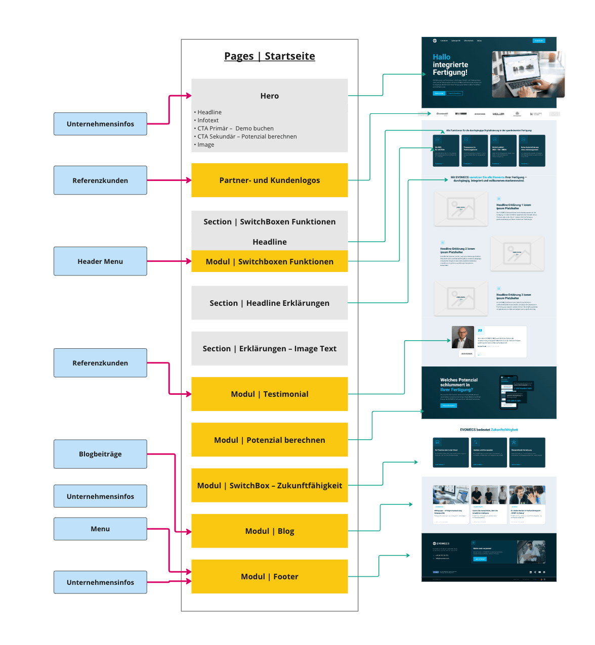 In der Konzeptionsphase wird mit Hilfe von Wireframes eine erste Skizze der Inhalte erstellt und gleichzeitig die Grundstruktur der Seite festgelegt. Dieser Schritt ist sehr entscheidend, da hier schon der Aufbau der Webseite konzipiert wird. Dabei halten wir engen Kontakt zur Entwicklung, um sicherzustellen, dass wir stets auf einem Nenner sind und sich gewisse Strukturen auch später beim Programmieren umsetzen lassen. Beim Projekt von Evomecs wurde übrigens die gesamte Struktur der Seite “Desktop-First” konzipiert. Der Grund dafür ist ganz einfach: Die Zielgruppe von Evomecs bewegt sich hauptsächlich über das Desktop auf die Seite, statt über Smartphones. Hier wird wieder deutlich, wie wichtig daher die Vorbereitung und der Kickoff-Workshop sind: entscheidende Komponenten, wie beispielsweise die Zielgruppe, sollten immer ganz zu Beginn festgelegt werden.